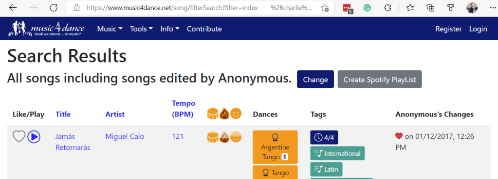 So I did some work to make sure that anyone who had chosen that setting is protected by not showing their name, and instead I use the single “Anonymous” moniker. I’m still tracking who those users are by means of a randomly generated number, but other visitors to the site will only see the user as “Anonymous”. That is even the case if you send a link to your songs to a friend. For instance, I’ve marked my test user “Charlie” as not wanting to share his profile, so if I’m logged on as Charlie and look at a list of Charlie’s songs then the list and changes to the songs are attributed to Charlie. But if I send that link to you, you’ll just see his changes attributed to Anonymous.