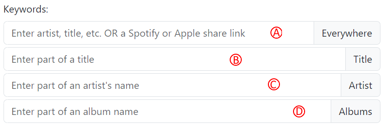 - Keywords: Type portions or song title, artist name or any other text shown on a song page. You may also drag and drop or paste a Spotify or Apple Music song share link into this field to go directly to a song. This is the same field described in Simple Search. If you are interested in doing a more sophisticated text search, click on the “more” button and read about text searching below.