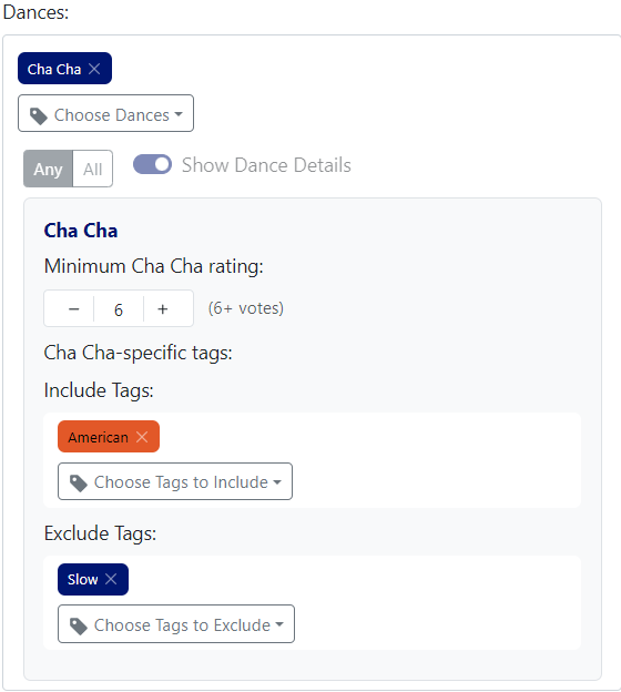 You can include or exclude dance-specific tags in a way very similar to how song tags are managed above. The difference is that these tags are only filtered when they are applied to the specific dance being edited. This allows for doing things like filtering on all “Slow” Cha Chas and not picking up songs that were tagged as “Slow” Salsas and untagged Cha Cha.