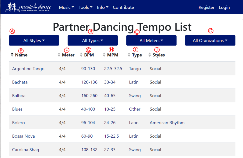 The organization filter (D) will show the tempi for organization and the classification of dancer – this will change the tempo numbers in the ‘MPM’ and ‘BPM’ columns to reflect the rules of the organization. (*)