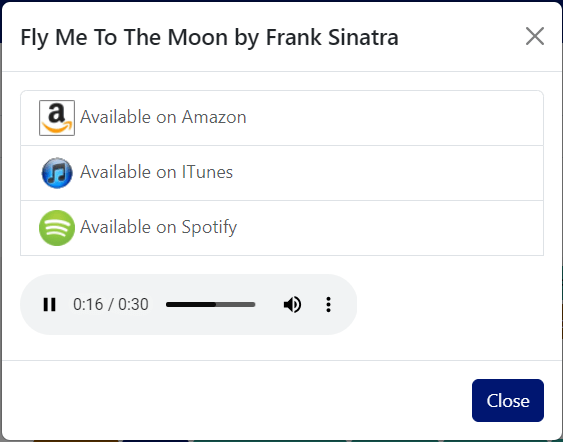 Clicking on any of the available options will open a new browser tab with the song. In most cases, it will also give you the option to play (or start playing) the song in the associated player. Also, if we were able to identify a playable clip on any of the music services that provide samples, you’ll be able to play the (usually 30-second) clip directly in this window.