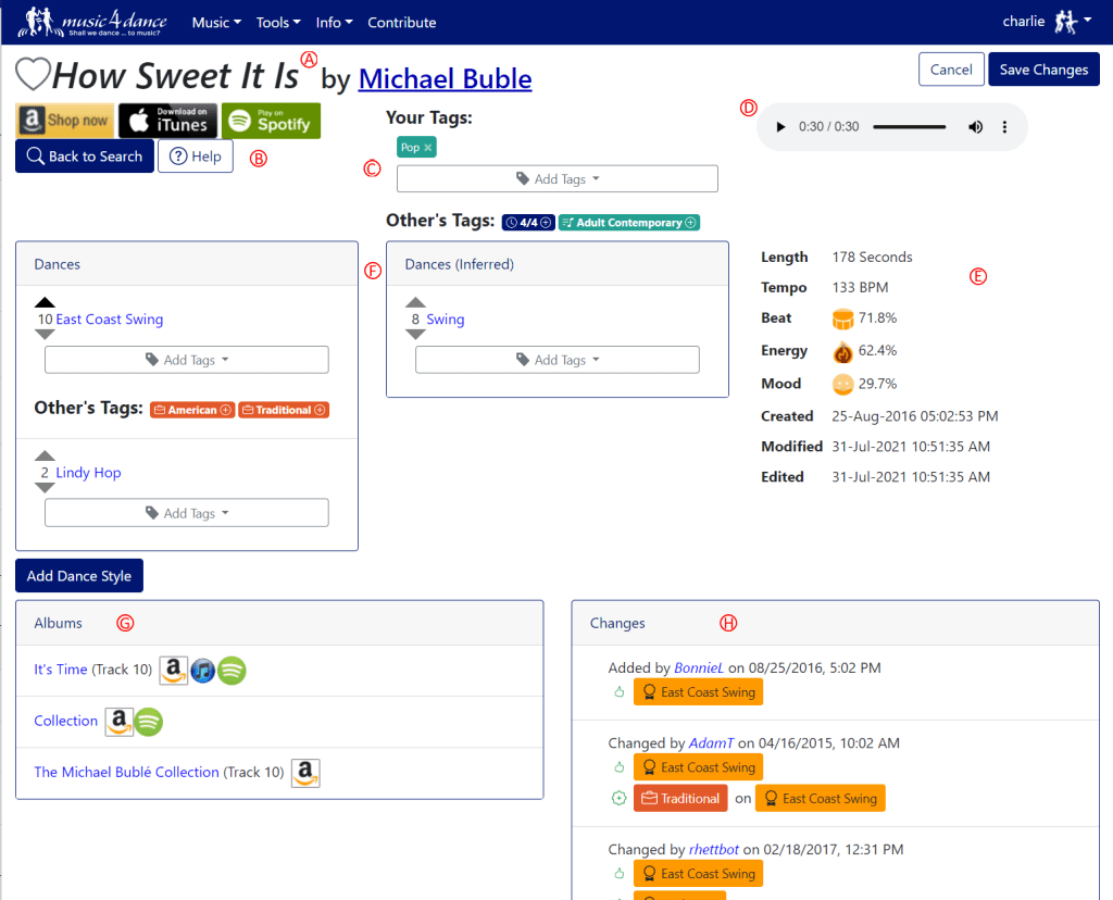 Below is a snapshot of a song details page for “(I’ve Had) The Time of My Life” as seen by a user “Charlie” while he is editing it. Some of the features will be slightly different if you aren’t signed in, but the general information is available to everyone.