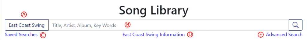 When you first choose the song library from the music menu on music4dance, you’ll be presented with a simple search header and a list of songs.