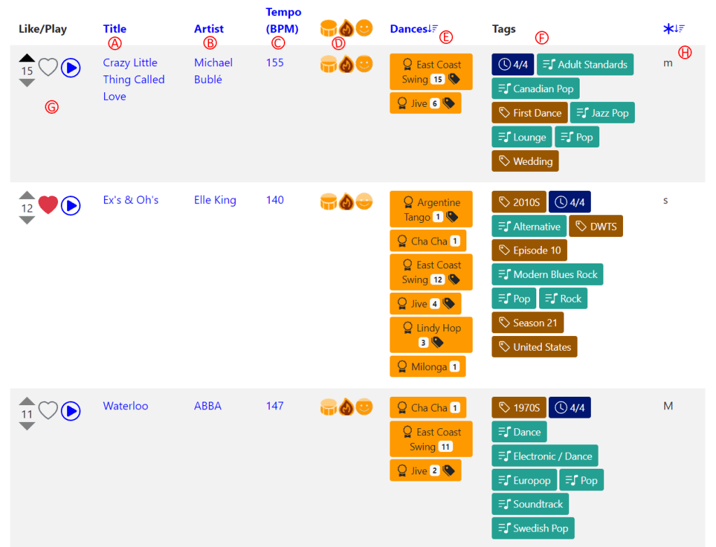 - Dance Vote: If you’ve searched on a specific dance style, you’ll see a number bracketed by an up and down arrow. The number indicates the aggregate number of votes that this song is danceable to the style that you’re searching for.