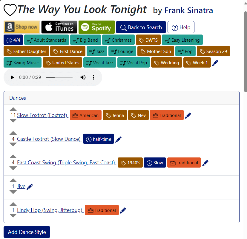 Once you have registered and logged in to the music4dance website, the song details page has some additional features.