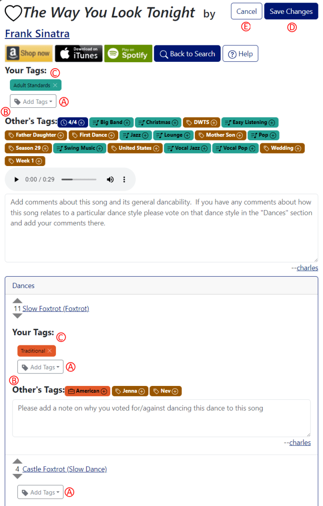 In edit mode, you’ll see “Add Tags” (A) drop-down buttons above the lists of tags, and each of the tag lists will be labeled as “Others’ Tags” (B). If you’ve already tagged the song or one of the dances, you’ll also see “Your Tags” (C) sections above the “Others’ Tags” sections.