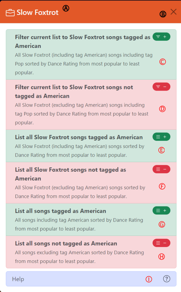 When clicking on a tag in the context of a Dance Style Tag (available from the dance modal shown above or on the dance details pages, you’ll see a modal similar to the Song Tag modal, but with slightly different options. The intent behind this modal is to allow you to filter on tags that are specific to a dance – for instance, to find all American Foxtrot songs, but not to find songs that might be tagged as American Rumba and also Foxtrot.