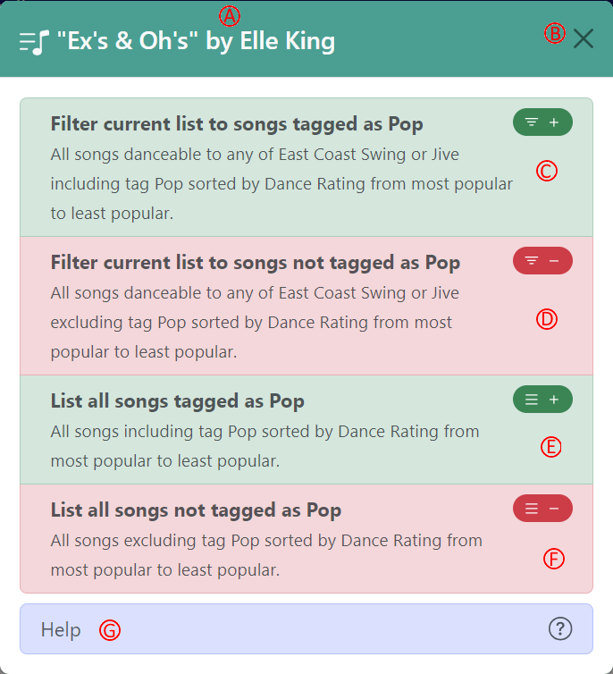 Clicking on a tag will pop up a list of filtering options. The most complete list of options (depending on context, these may not all be available) includes (the current filter in the example is all songs danceable to either East Coast swing or Jive and the user clicked on the “Pop” tag):